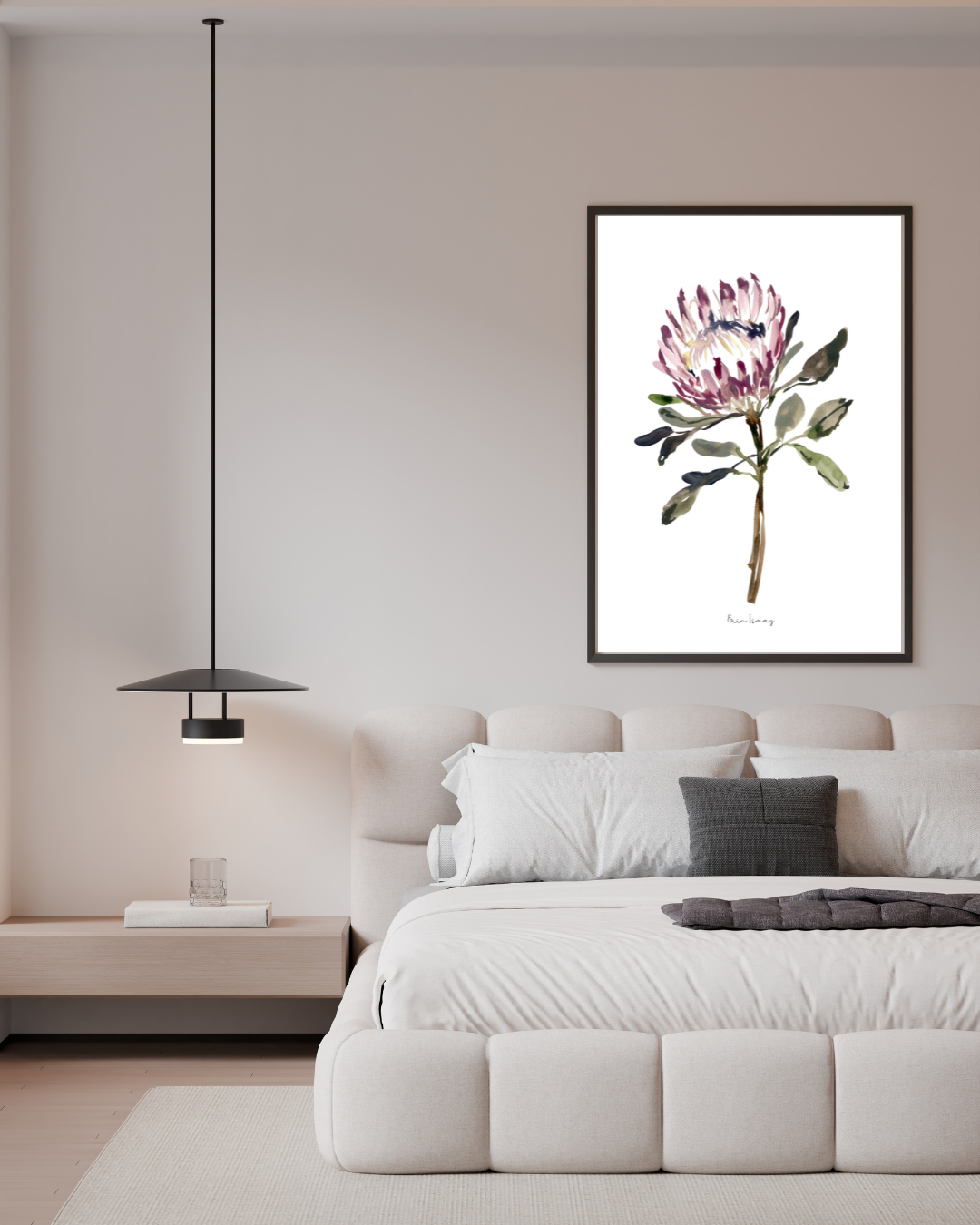 The iconic King Protea is always a favorite. This piece painted in vintage colours brings to life the rose of South Africa. Painted loosely to blend easily into the modern muted interior.